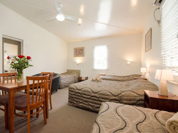 Our Self Contained Cabins are perfect for longer stays and families. The Family Cabins consist of 1 Queen Bed and 2 Single Beds, separate living area, ensuite with shower, LED flat screen TV, kitchen facilities, iron and ironing board. Also includes free wifi and free parking!