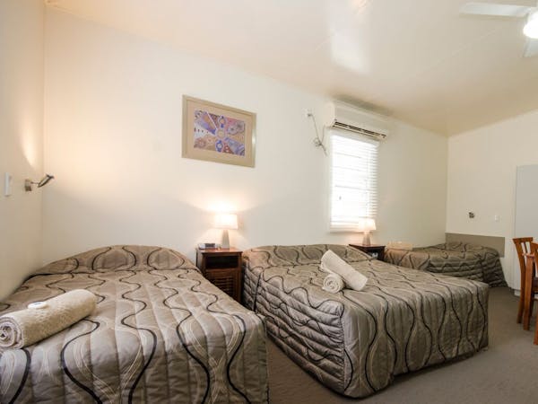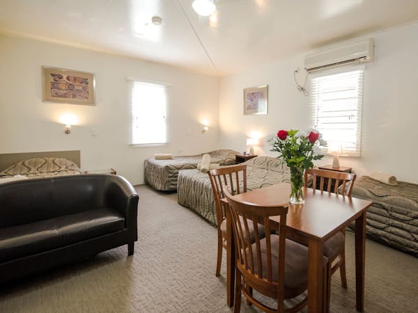 This Family Room consists of 1 Queen Bed, 1 King Single and 1 Single bed. Features include air conditioning, LED flat screen TV, tea and coffee making facilities, iron and ironing board, hairdryer and ensuite with walk in shower. Also includes free wifi and parking!