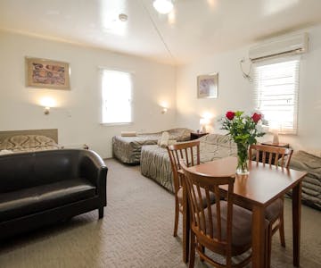 This Family Room consists of 1 Queen Bed and 2 King Single beds. Features include air conditioning, LED flat screen TV, tea and coffee making facilities, iron and ironing board, hairdryer and ensuite with walk in shower. Also includes free wifi and parking!
